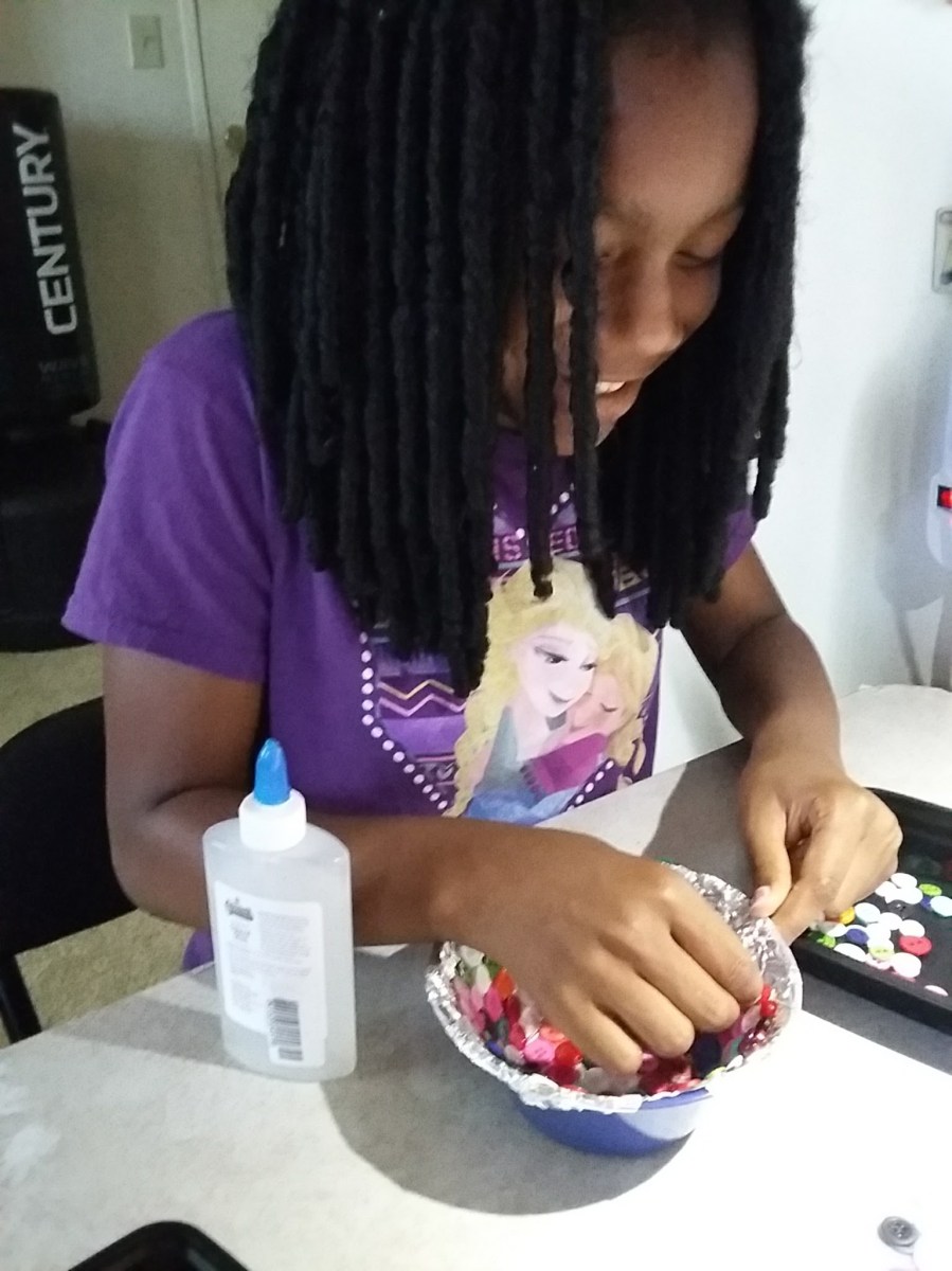 20170702_174308 Published July 10, 2017 at 1536 × 2048 My 10-year-old granddaughter, Miss Kaiere, gluing her buttons.