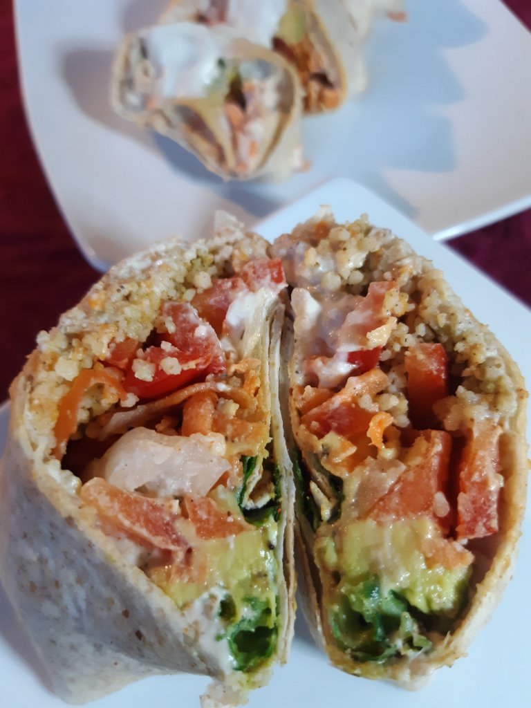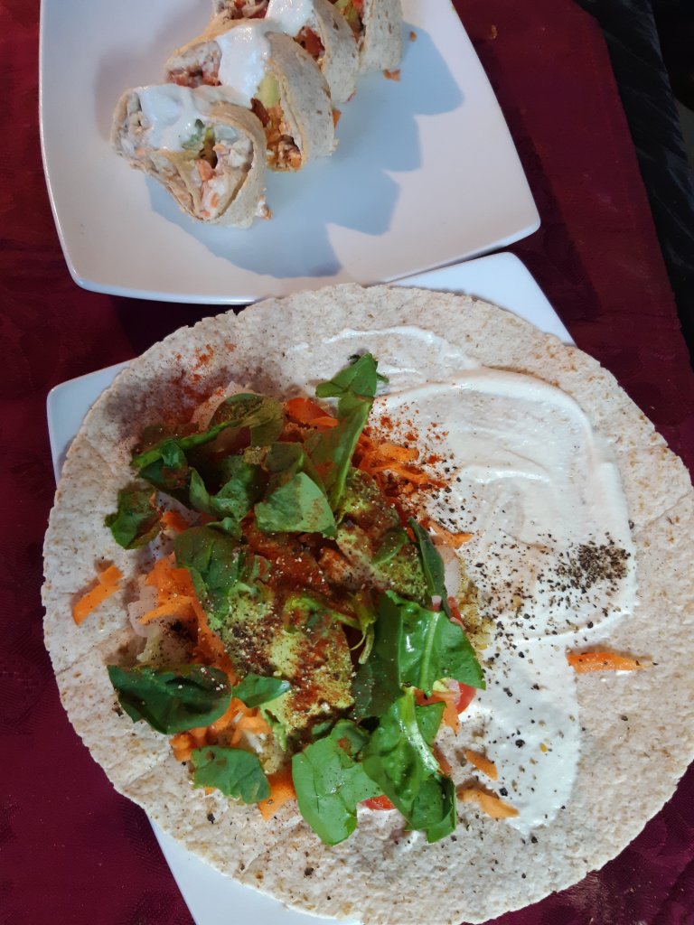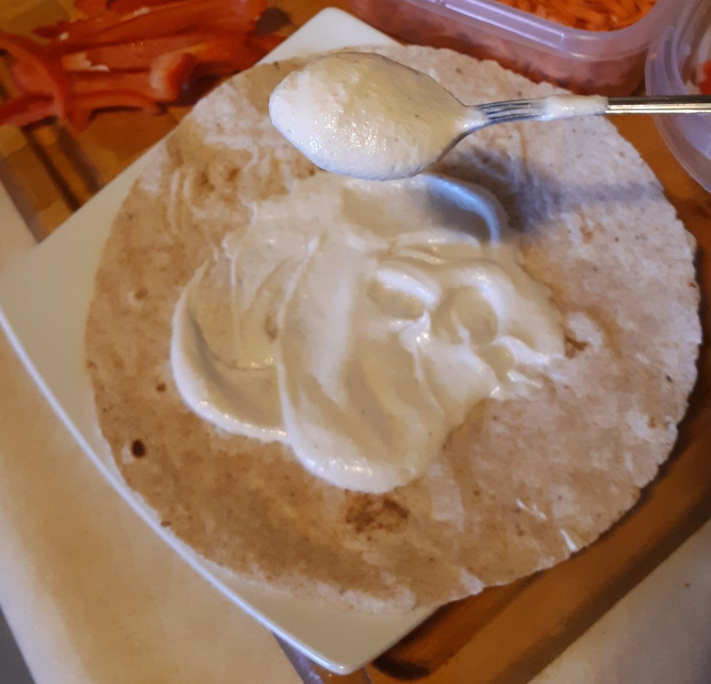 I made this creamy sauce by soaking the cashew overnight. In the morning I drained the liquid, adding cashew milk, half a block of silken tofu and blending. I used it in this veggie wrap but I also use this creamy sauce as a salad dressing, and as a substitute for mayonnaise when I eat a veggie burger. If you haven’t tried making sauces with cashews, get some raw cashews and drop me a line to let me know how you liked them.